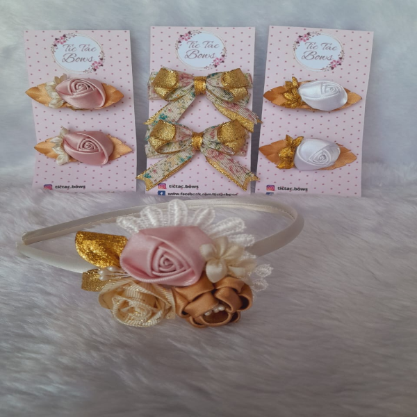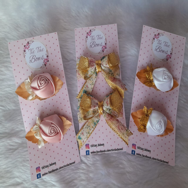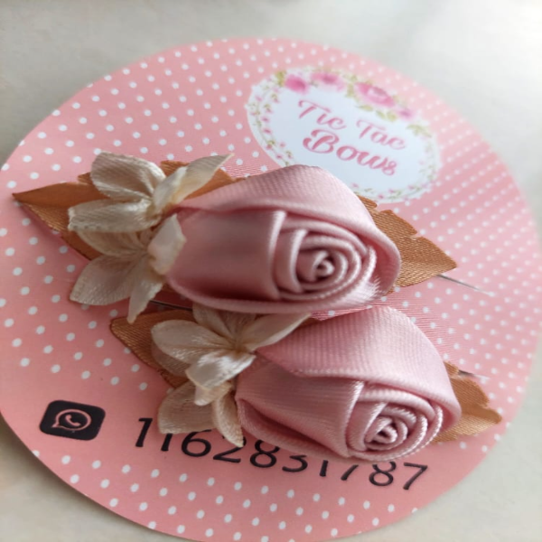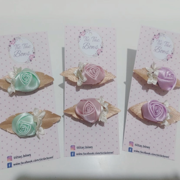 Par de hebillas con aplique de rosas y flores, realizados en raso y lurex